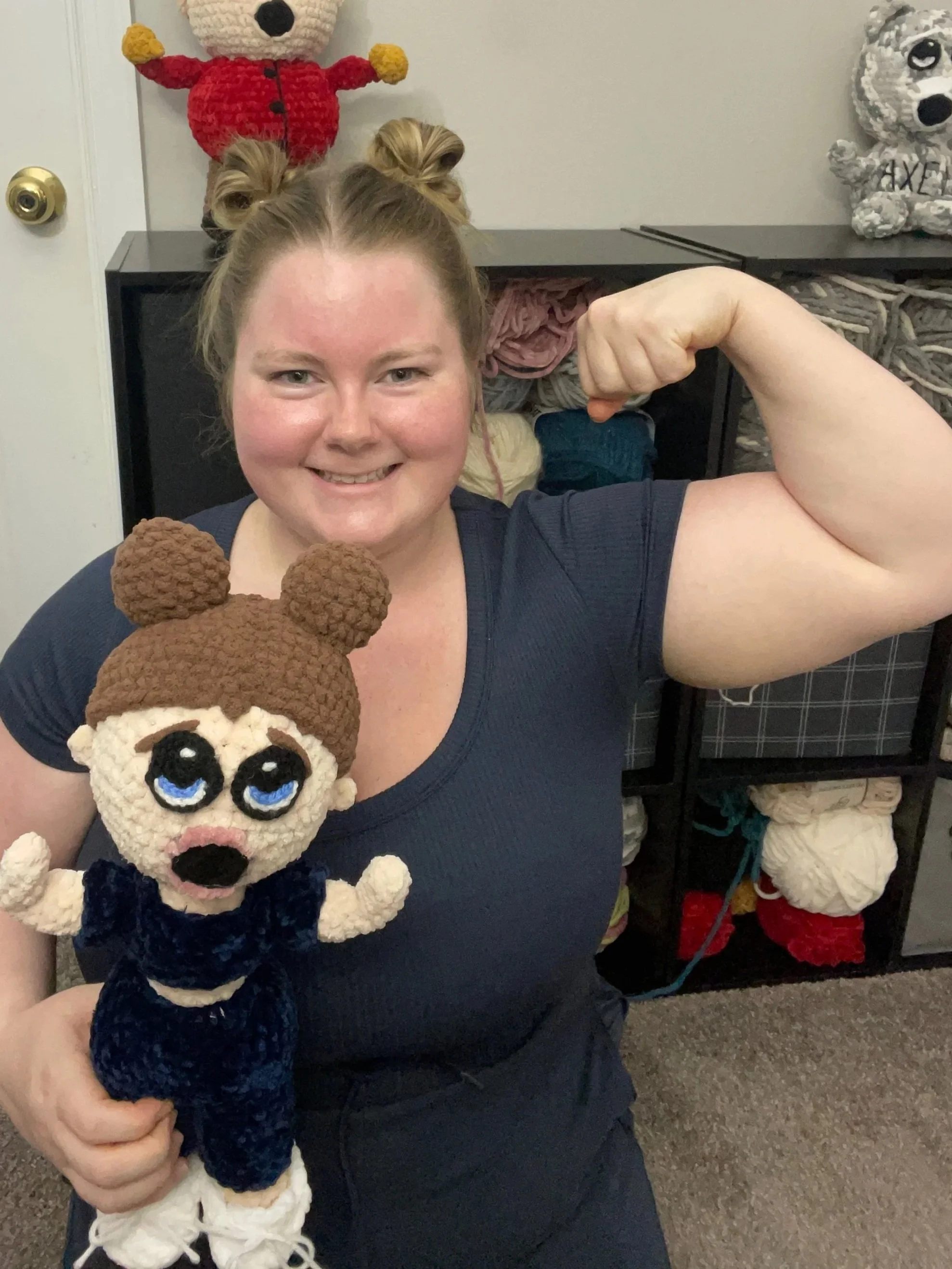 While I am a singer by day, by night I love to crochet! Combining my love of singing, lifting, and making things, I make “swole” stuffies. We have Swole Stars (famous people/ characters), Swole Stuffies (animals of all shapes and sizes), and Swole Self (which are customizable to you).